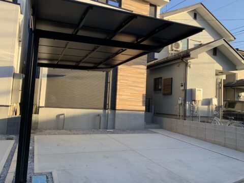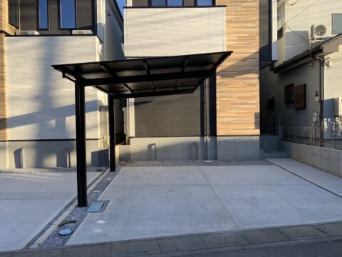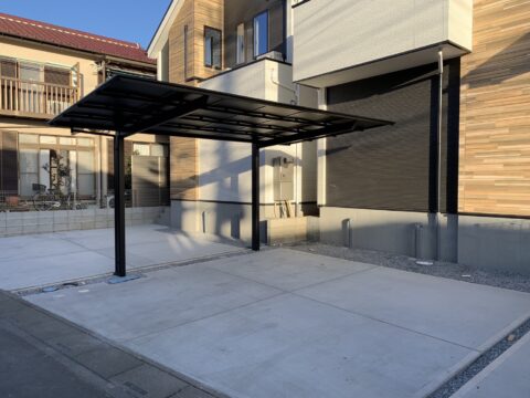 工事内容は、タイルテラス・手摺取り付け、カーポート設置工事です。